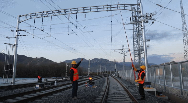 此次接觸網(wǎng)受電,由協(xié)榮站、扎囊站、山南站依次往林芝車站進行,全線共有11座變電所、23個供電臂,整個受電過程歷經1小時29分。