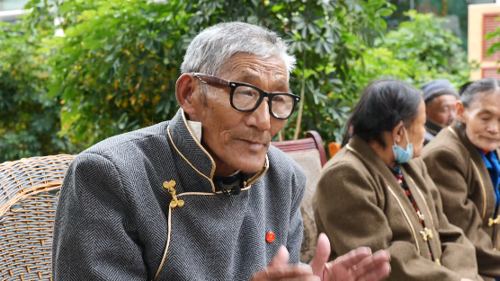 阿里地區(qū)老人護(hù)理院老人 拉松(藏語):護(hù)理員們經(jīng)常給我們洗頭、洗澡、剪指甲,就像對待自己的親生父母一樣照顧我們,不嫌臟。好吃好喝都有,平時還可以跟其他老人一起玩玩骰子、打打撲克,很開心、很快樂,這都是國家的恩惠。