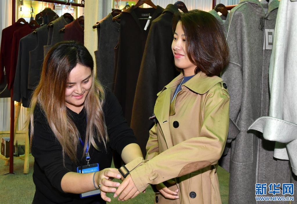 顧客在藏博會(huì)上試穿當(dāng)?shù)禺a(chǎn)的服裝(2018年9月8日攝)。 新華社記者 覺(jué)果 攝