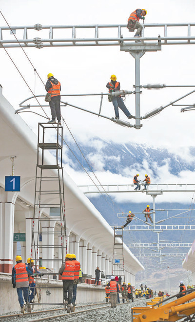 4月1日,中鐵電氣化局集團(tuán)技術(shù)工人在林芝火車站進(jìn)行接觸網(wǎng)精調(diào)作業(yè)。焦宏濤攝(新華社發(fā))