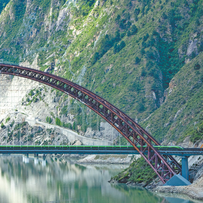 6月21日,拉林鐵路測(cè)試車輛通過(guò)山南市加查縣的藏木特大橋。記者 徐馭堯攝