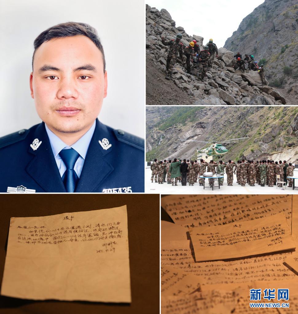 這是一張拼版照片:左上圖為共產(chǎn)黨員、邊防戰(zhàn)士邵明貴;右上圖和右中圖為邵明貴和戰(zhàn)友在轉(zhuǎn)移地震受災(zāi)群眾;左下圖為邵明貴寫(xiě)下的遺書(shū);右下圖為吉隆邊防檢查站邊防戰(zhàn)士寫(xiě)下的遺書(shū)(資料照片)。新華社發(fā)