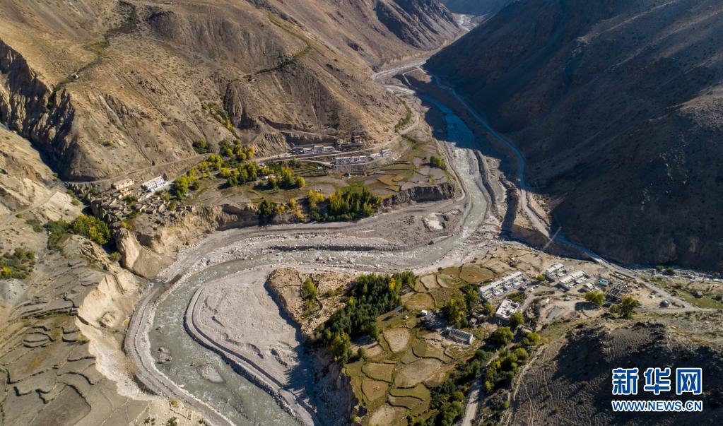 俯瞰西藏阿里地區(qū)札達(dá)縣楚魯松杰鄉(xiāng)楚松村楚魯組,蜿蜒的如許藏布江穿過(guò)村落(2018年9月16日攝,無(wú)人機(jī)照片)。新華社記者 旦增尼瑪曲珠 攝