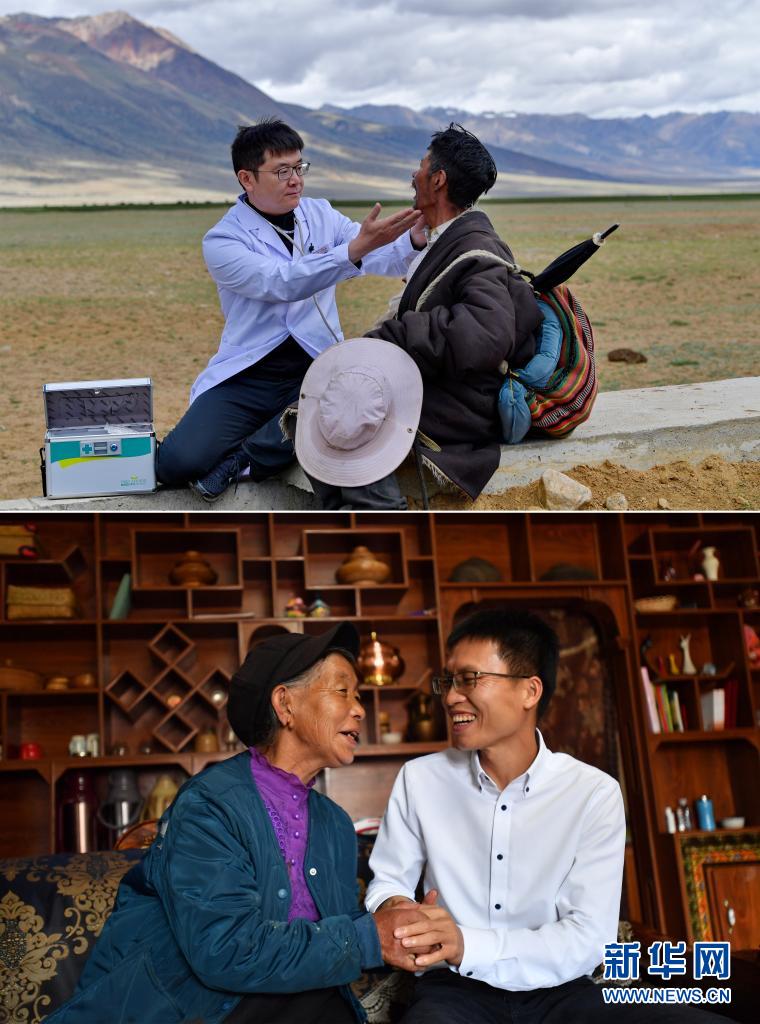 這是一張拼版照片:上圖為北京援藏醫(yī)生王克明(左)在西藏當(dāng)雄縣格達(dá)鄉(xiāng)格達(dá)村牧場(chǎng)為牧民義診(2021年6月19日攝,新華社記者張汝鋒攝);下圖為在西藏林芝市米林縣,廣東援藏干部黃南蔭(右)與珞巴族老阿媽亞加在一起(2021年6月19日攝,新華社記者覺(jué)果攝)。新華社發(fā)