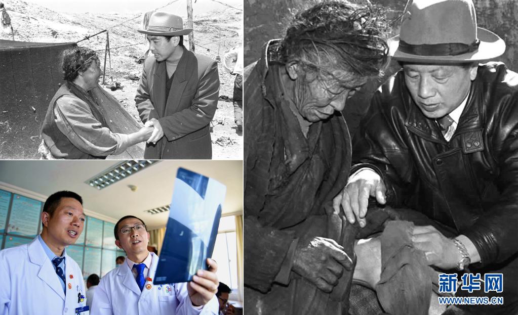 這是一張拼版照片:左上圖為來(lái)自陜西的援藏干部、阿里日土縣副縣長(zhǎng)賈冗勇深入牧區(qū),幫助藏族牧民解決生產(chǎn)、生活的實(shí)際困難(新華社記者土登攝,1997年11月11日發(fā));左下圖為2017年8月3日,北京積水潭醫(yī)院援藏醫(yī)生龔曉峰(右)和北京天壇醫(yī)院援藏醫(yī)生李家謀在拉薩市人民醫(yī)院骨科病房?jī)?nèi)查看患者的X光片,進(jìn)行工作交接(新華社記者晉美多吉攝);右圖為孔繁森(右)在阿里日土縣過(guò)巴鄉(xiāng)為孤寡老人益西卓瑪治病(新華社記者土登攝,1994年12月26日發(fā))。新華社發(fā)
