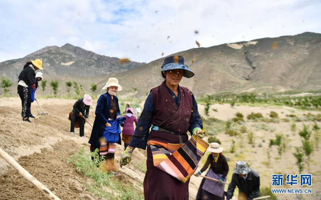 在山南市全國(guó)防沙治沙綜合示范區(qū),當(dāng)?shù)厝罕娫谏车厣显苑N樹苗(7月20日攝)。新華社記者 晉美多吉 攝