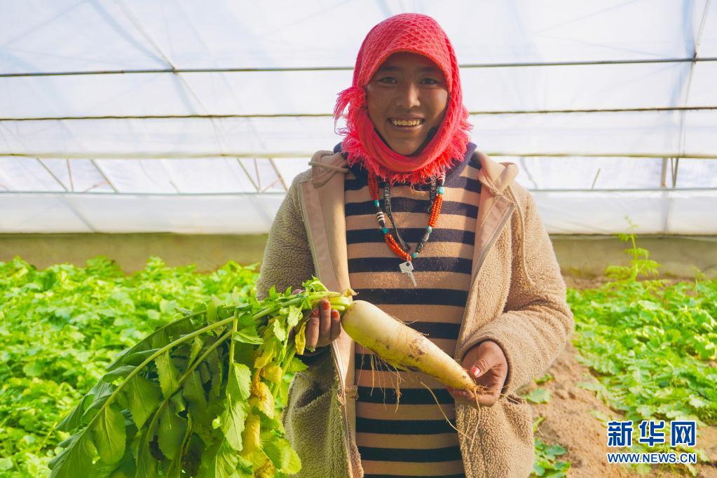 西藏阿里改則縣日瑪村村民央金在改則產業(yè)園蔬菜大棚展示收獲的蔬菜(2021年3月31日攝)。新華社記者 田金文 攝