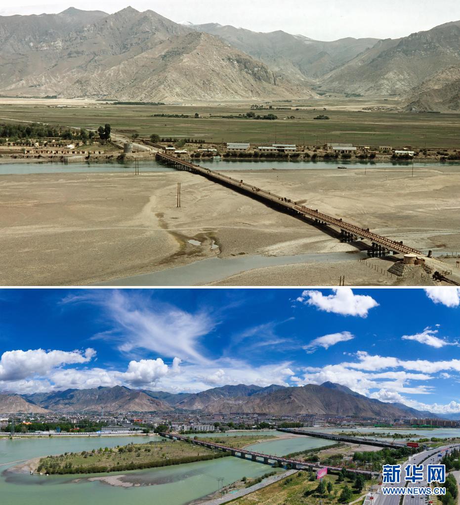 拼版照片:上圖是20世紀(jì)50年代的拉薩大橋(新華社記者王純德攝);下圖是2021年8月9日拍攝的拉薩大橋新貌(新華社記者孫非攝,無人機(jī)照片)。新華社發(fā)