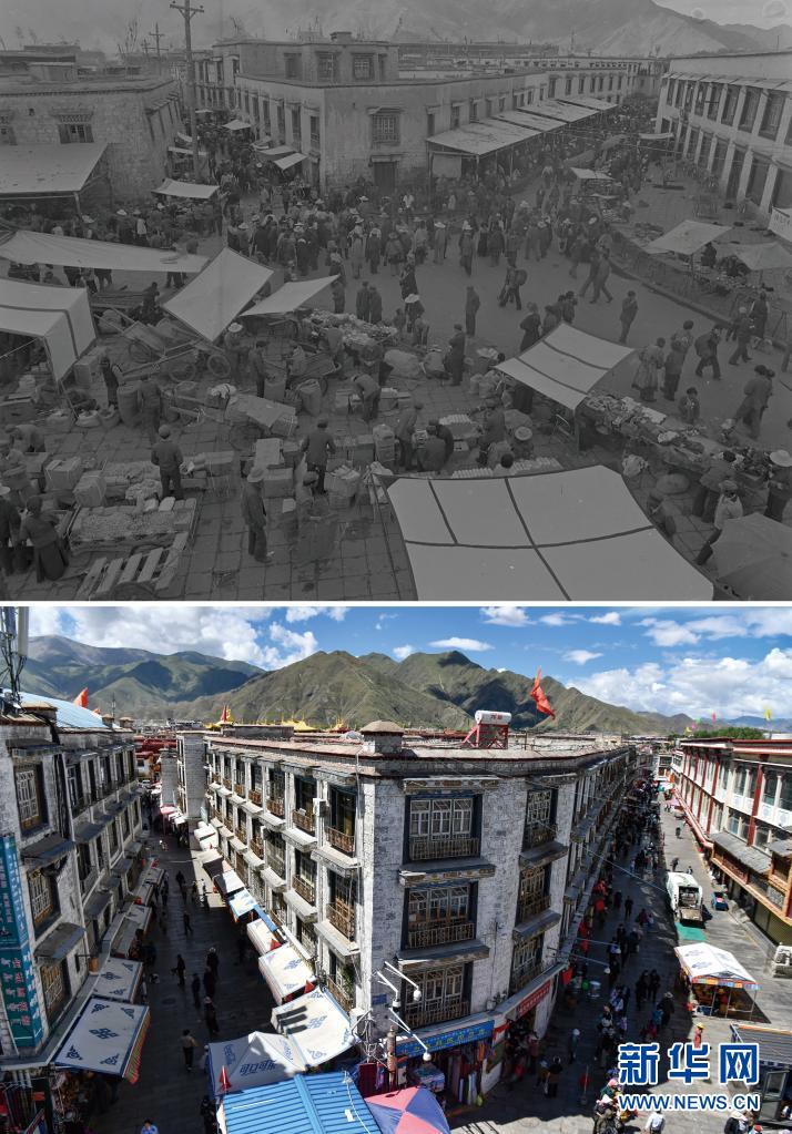 拼版照片:上圖是20世紀(jì)50年代的拉薩市八廓街(新華社記者王純德攝);下圖是2021年8月13日拍攝的拉薩市八廓街(新華社記者覺果攝)。新華社發(fā)