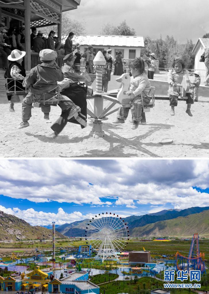 拼版照片:上圖是20世紀(jì)80年代,日喀則幼兒園的孩子們?cè)谕鎰?dòng)物圓盤轉(zhuǎn)椅(新華社記者程曦?cái)z);下圖是2021年8月9日拍攝的拉薩市象雄美朵游樂園(新華社記者張汝鋒攝,無人機(jī)照片)。新華社發(fā)