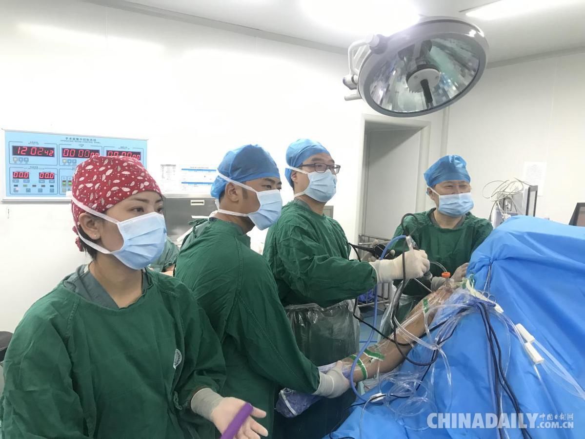 程序醫(yī)生和西藏自治區(qū)人民醫(yī)院醫(yī)生一道開展肩袖撕裂鏡下手術(shù)。中國日報達窮攝