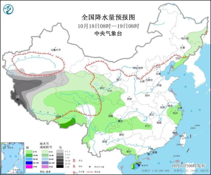 10月17日08時至18日08時,內蒙古東北部、新疆南疆西部山區(qū)等地部分地區(qū)有小到中雪,其中,西藏西部等地部分地區(qū)有大雪(5~7毫米)。海南島等地部分地區(qū)有中到大雨,其中,海南島東南部等地部分地區(qū)有暴雨(50~80毫米)。內蒙古中部、西藏北部等地部分地區(qū)有4~5級風(見圖1)。