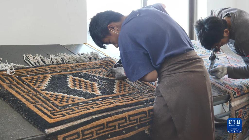 江孜昵煒藏毯廠工人正在對卡墊進行修剪。(2021年10月29日)新華社記者洛卓加措 攝