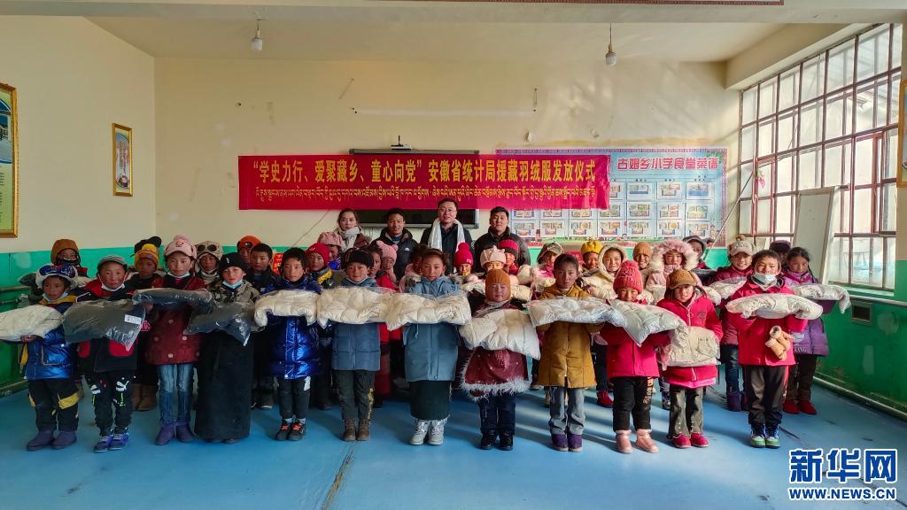 “孩子們,排好隊(duì),快到食堂去領(lǐng)羽絨服?!?央吉措姆老師高興地對(duì)一年級(jí)的學(xué)生說(shuō)道。待孩子們來(lái)到食堂,這里已是熱鬧一片??吹綊熘皩W(xué)史力行、愛聚藏鄉(xiāng)、童心向黨”愛心羽絨服發(fā)放儀式的橫幅,孩子們才恍然大悟,原來(lái)是援藏的叔叔給他們送新羽絨服來(lái)了。