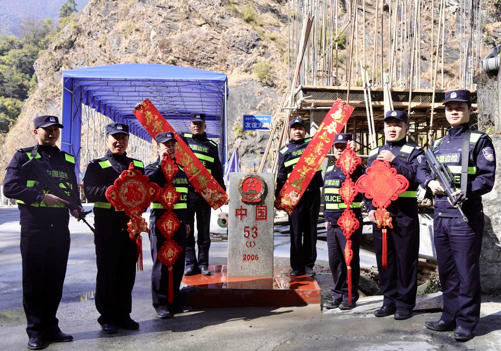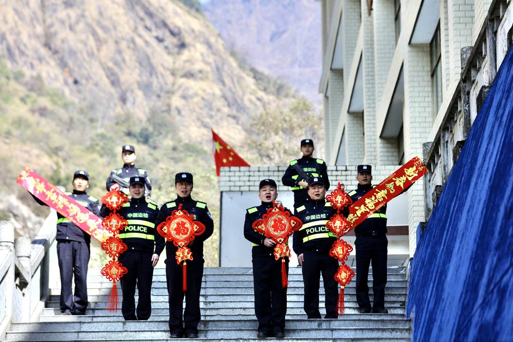 中尼友誼橋執(zhí)勤點(diǎn)民警向全國人民拜年。索朗次仁攝