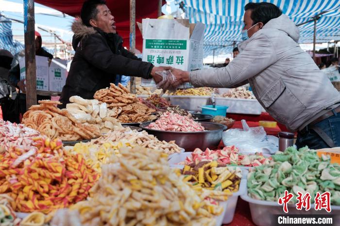 以農(nóng)耕為主的日喀則有“西藏糧倉(cāng)”之稱,為不耽誤農(nóng)事,包括日喀則在內(nèi)的農(nóng)耕區(qū)習(xí)慣提前一個(gè)月,在藏歷十二月慶祝新年,被稱為日喀則農(nóng)事新年。1月31日是春節(jié)除夕,恰逢日喀則農(nóng)事新年的“古突夜”,小新在日喀則年貨市場(chǎng)看到,該市場(chǎng)內(nèi)的“卡塞”、青稞苗、“羅薩美朵”、牦牛肉干、酥油、糖果等各類藏式年貨琳瑯滿目,大家也抓緊時(shí)間置辦,為晚上熱熱鬧鬧過“古突”做最后的準(zhǔn)備。