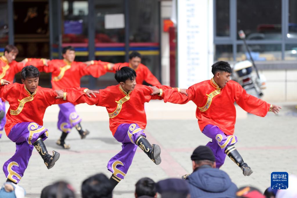 搬遷牧民在搬遷點(diǎn)廣場上跳起民族舞蹈,迎接藏歷新年(2月28日攝)。新華社記者 覺果 攝