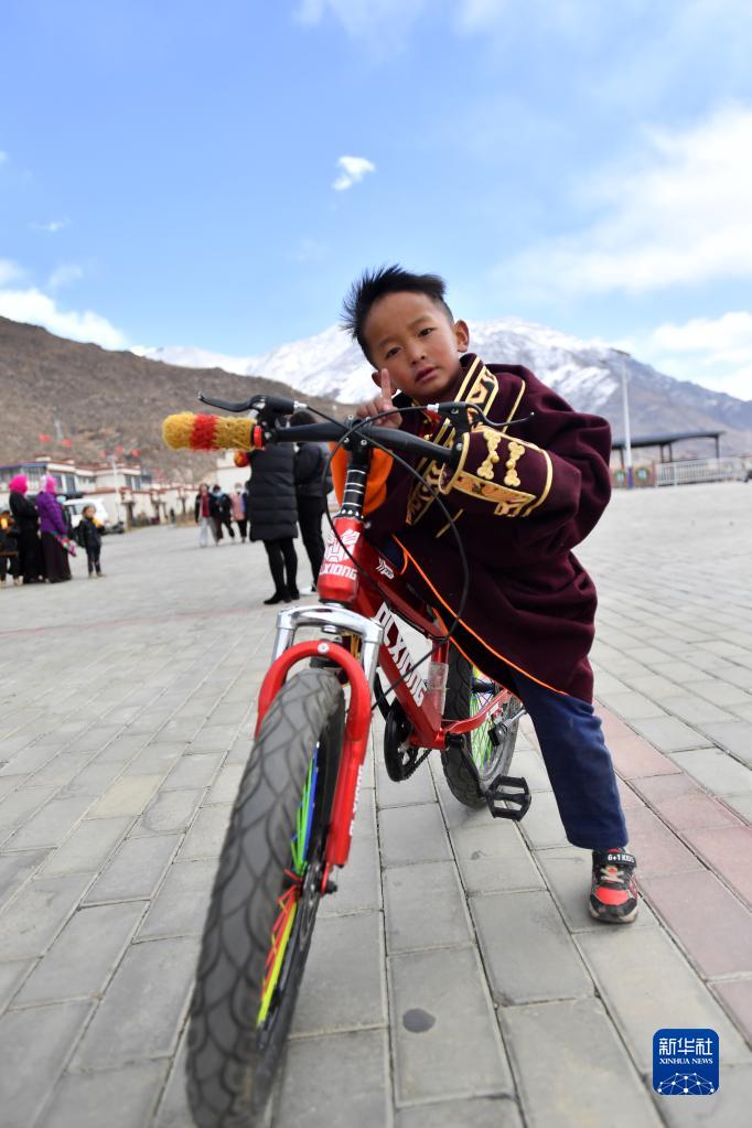 一位搬遷牧民家的孩子在榮瑪高海拔生態(tài)搬遷點(diǎn)騎自行車玩耍(2月28日攝)。新華社記者 覺果 攝