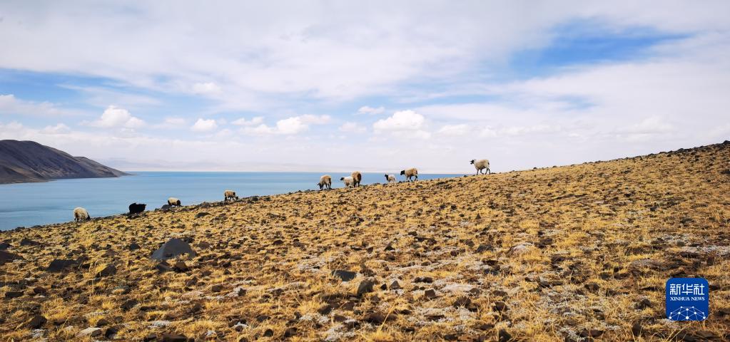 在位于西藏自治區(qū)那曲市的巴木錯(cuò),羊群在湖邊吃草(2022年4月13日攝,手機(jī)照片)。新華社記者 沈虹冰 攝