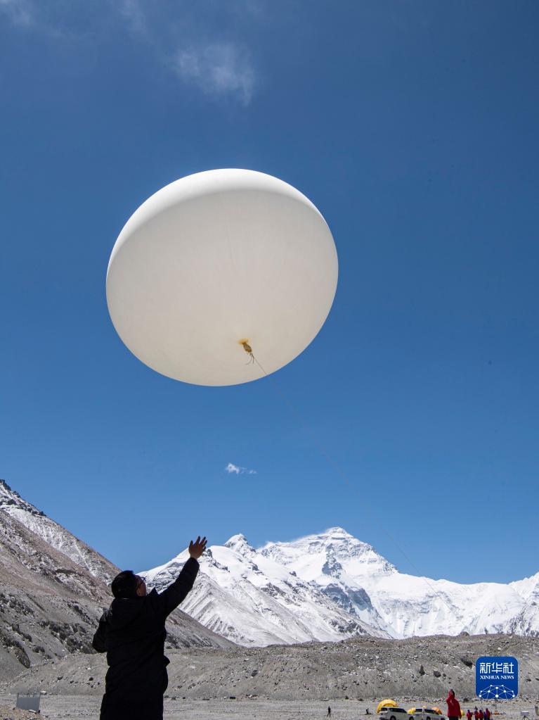 在珠峰登山大本營(yíng),科研人員施放大氣臭氧探空氣球(5月3日攝)。新華社記者 孫非 攝