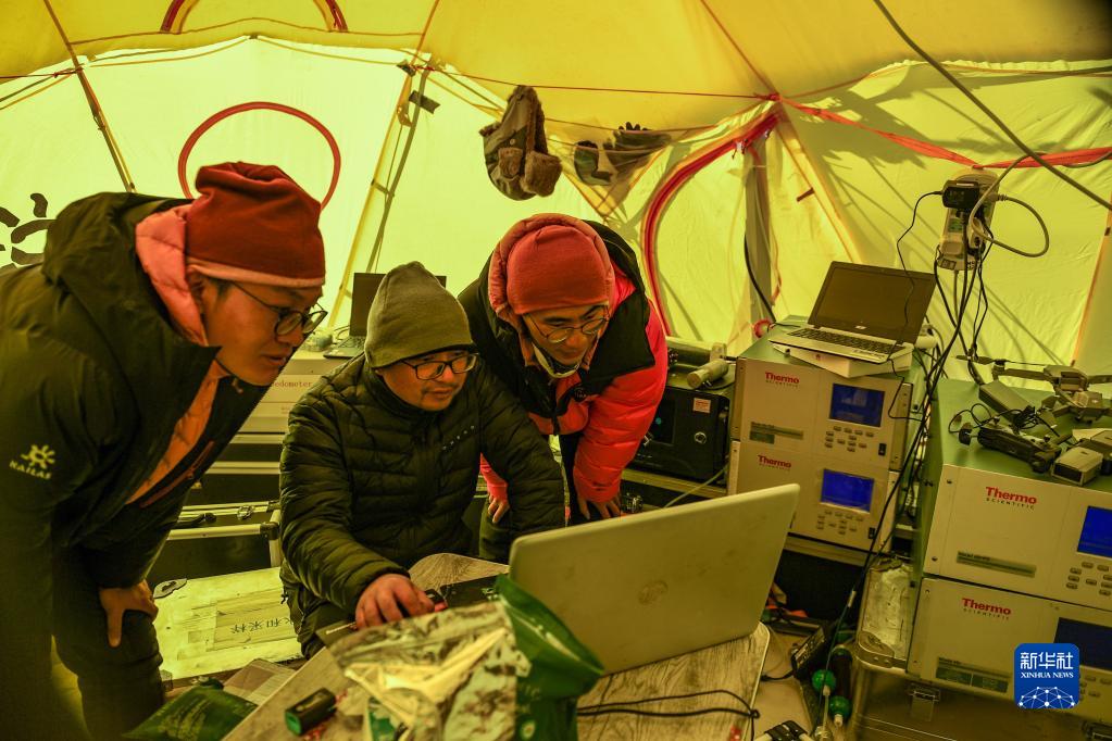 在珠峰登山大本營(yíng),科研人員查看大氣數(shù)據(jù)(5月3日攝)。新華社記者 姜帆 攝