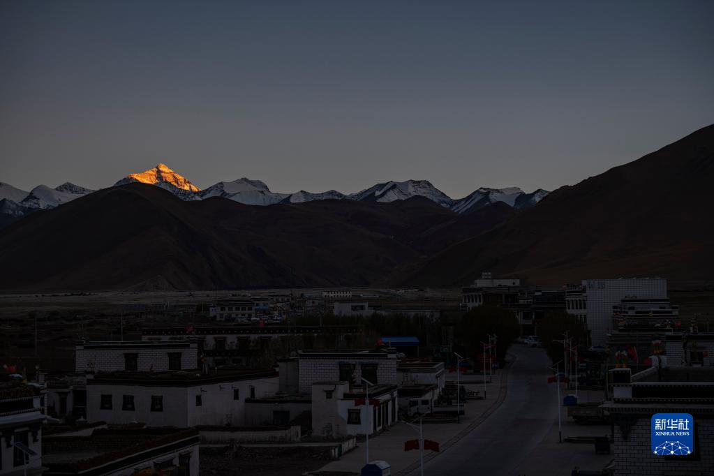 落日余暉灑在珠峰上,扎西宗鄉(xiāng)慢慢沉睡(5月10日攝)。新華社記者 孫非 攝
