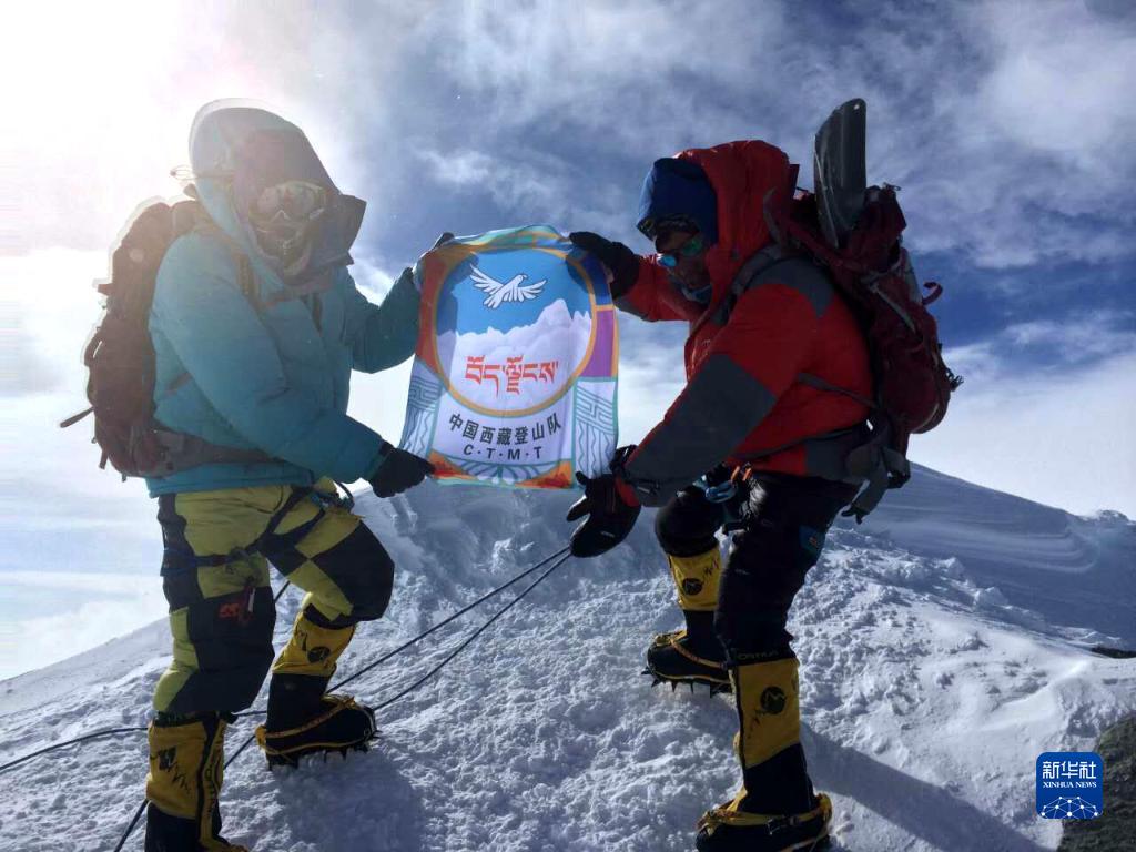 在珠穆朗瑪峰峰頂,科考隊員展示第二次青藏高原綜合科學考察研究旗幟。