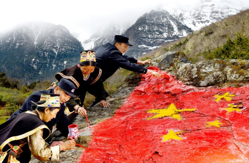 圖為玉麥邊境派出所戍邊民警與“時代楷模”獲得者卓嘎、央宗姐妹共同描繪國旗。蔣美靈 攝