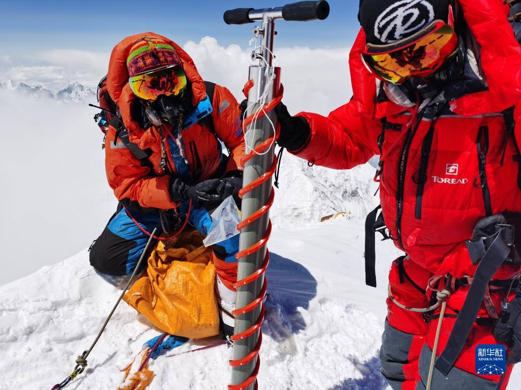5月4日,德慶歐珠帶領(lǐng)的登頂小組科考隊(duì)員,在珠峰海拔8830米處架設(shè)世界海拔最高自動(dòng)氣象站,建成珠峰梯度氣象觀測(cè)體系;在峰頂首次利用高精度雷達(dá)測(cè)量冰雪厚度,并采集了峰頂冰雪樣品。