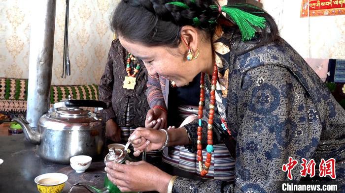 圖為小妹米瑪給來(lái)訪客人品嘗底雅鄉(xiāng)特色杏子酒。貢桑拉姆 攝