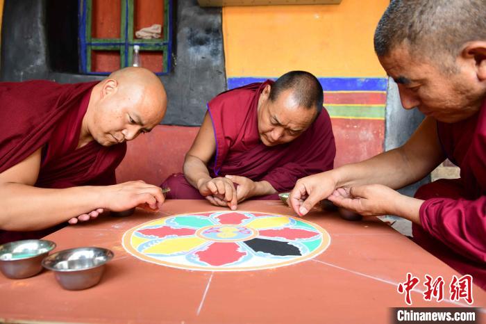 圖為哲蚌寺僧人演示彩砂壇城繪制。貢嘎來(lái)松 攝