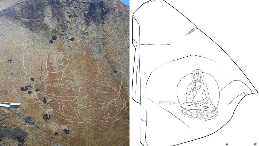 自治區(qū)文物保護研究所研究員夏格旺堆說,這一石刻造像群造像技法皆為陰線刻,雕工技術嫻熟,線條流暢。此外,部分石刻群區(qū)域不僅造像分布集中,而且在其周圍可見地面石砌建筑遺址,推測應當與早期佛教修行場相關。石刻群中,部分造型還反映出較為明顯的元代特征、吐蕃晚期或吐蕃分裂不久后的吐蕃遺風。