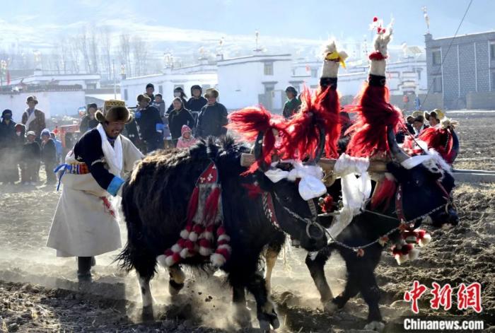 拉薩堆龍德慶區(qū)德慶村村民舉行傳統(tǒng)春耕儀式。中新社發(fā) 李林 攝