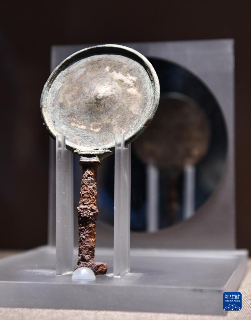 這是6月29日拍攝的西藏博物館新館展品——早期金屬時代的鐵柄銅鏡。該銅鏡出土于拉薩曲貢遺址,鏡體為銅質(zhì),柄為鐵質(zhì),鏡背飾雙鳥、卷草紋,似有牦牛圖象。新華社記者 晉美多吉 攝