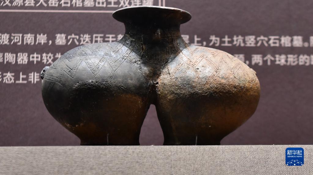 這是6月29日拍攝的西藏博物館收藏的雙體陶罐。該陶罐出土于西藏昌都卡若遺址,是新石器時代西藏陶器的代表作。新華社記者 晉美多吉 攝