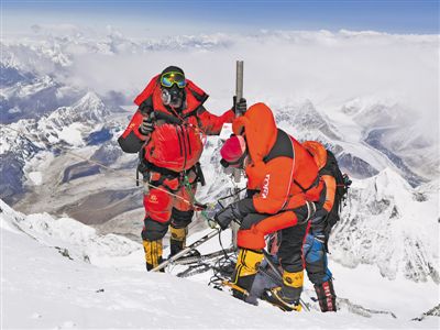 科考隊員在珠峰海拔8800米以上架設自動氣象站。新華社特約記者 索朗多吉攝