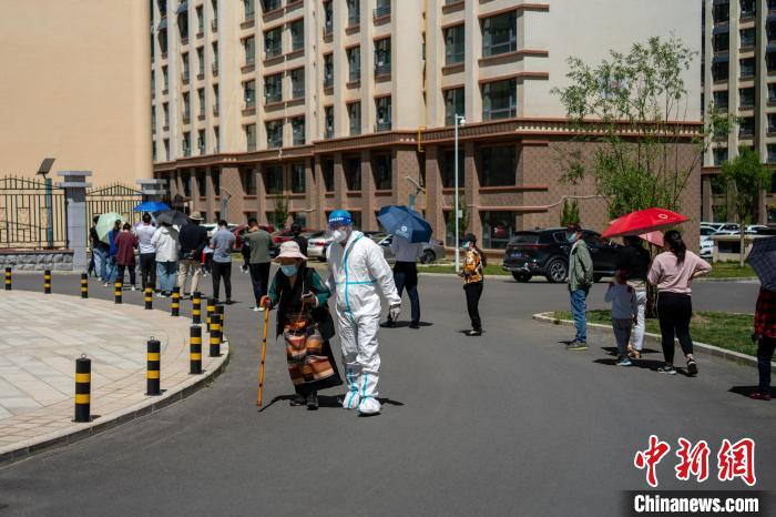 圖為8月12日,拉薩一小區(qū)內(nèi),工作人員攙扶藏族老人進行核酸檢測。 江飛波 攝