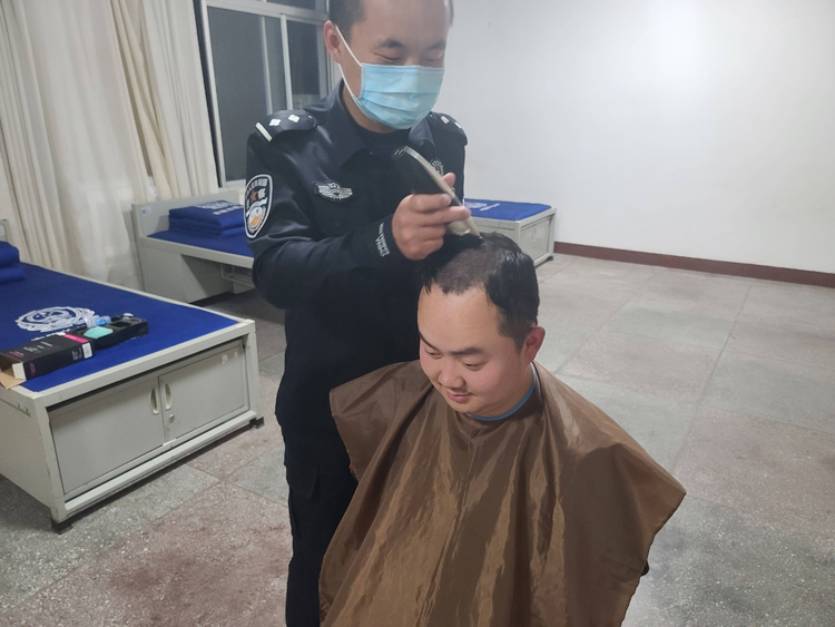 在隔離酒店執(zhí)勤的副所長(zhǎng)王士博,在完成工作后請(qǐng)同事幫忙給自己剃了個(gè)光頭,“當(dāng)前疫情防控形勢(shì)嚴(yán)峻,天氣逐漸變暖,每天穿著防護(hù)服工作,一身都是汗?!蓖跏坎┱f,剃掉頭發(fā)后更加涼快,在節(jié)省時(shí)間的同時(shí)也能避免頭發(fā)沾染病毒,更加安全。