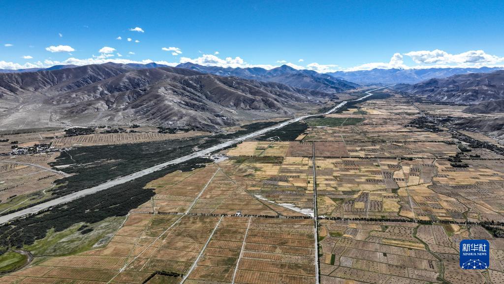 西藏日喀則江孜段富饒的農(nóng)田(9月19日攝,無(wú)人機(jī)照片)。新華社記者 晉美多吉 攝