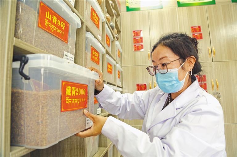 瓊結(jié)縣農(nóng)業(yè)農(nóng)村局高級農(nóng)藝師尼瑪卓嘎在查驗藏青2000種子。記者 次旺 通訊員 倫珠澤仁 攝