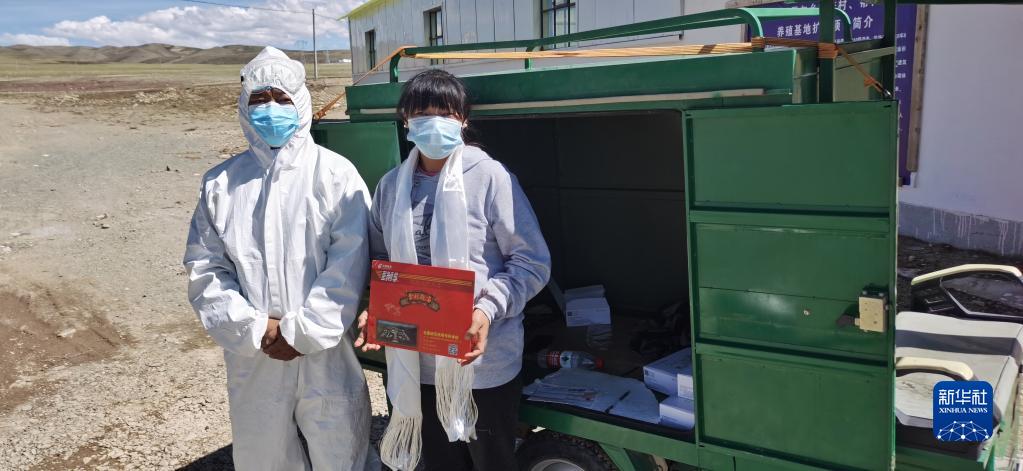 巴桑彭措(左)將錄取通知書送到牧區(qū)孩子手中。(受訪者供圖)