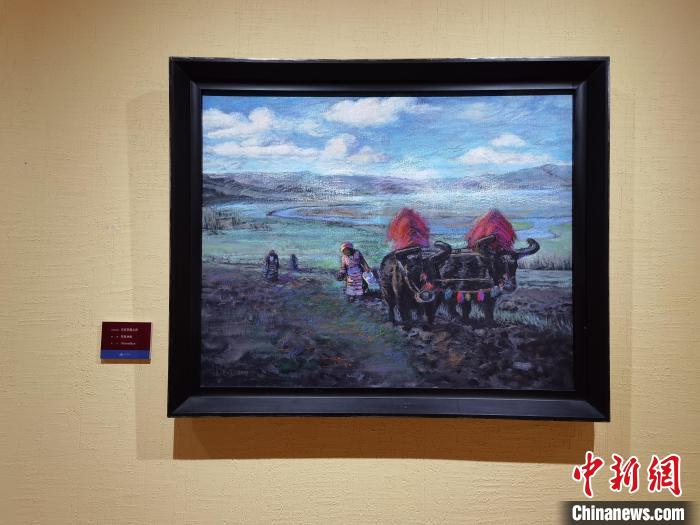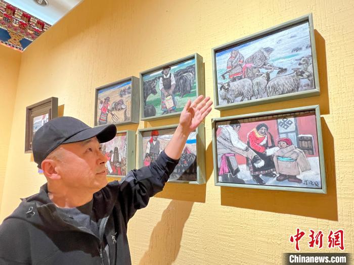 策展人李亞男向中新網(wǎng)記者介紹,崔曉曉首次到西藏那曲便結(jié)識(shí)了一位當(dāng)?shù)嘏笥选?,他將這位藏族青年放牧、添置汽車(chē)、蓋新房等畫(huà)面用畫(huà)筆記錄了下來(lái),在本次展覽中展出。
