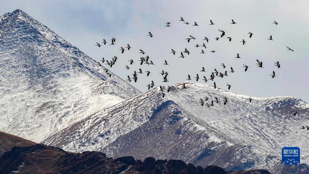 黑頸鶴群飛過林周縣強嘎鄉(xiāng)境內(nèi)山梁(11月6日攝)。新華社記者 姜帆 攝