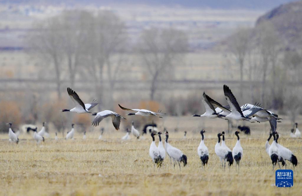 林周縣強嘎鄉(xiāng)田野里的黑頸鶴(11月6日攝)。新華社記者 張汝鋒 攝