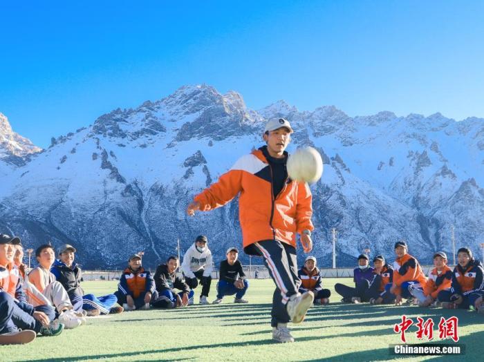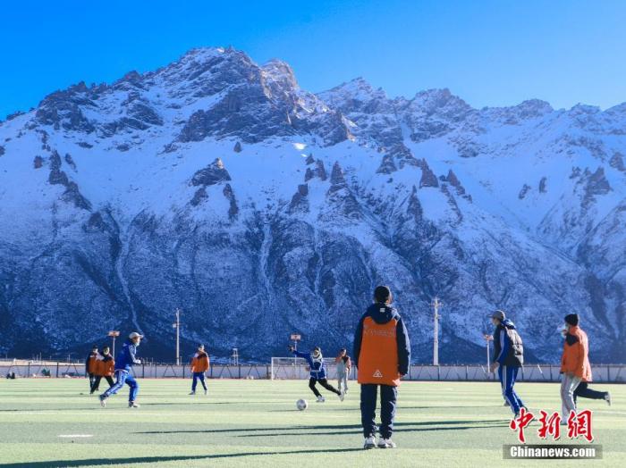 圖為11月25日,西藏那曲市嘉黎縣中學(xué)學(xué)生們在“雪山下的夢幻足球場”上進行足球訓(xùn)練。中新社記者 貢嘎來松 攝