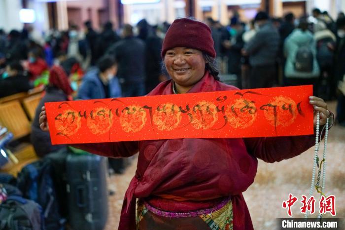 圖為春運(yùn)首日,拉薩火車站一旅客獲得車站送的藏式春聯(lián),上面書寫的是藏語“扎西德勒 吉祥如意”。 江飛波 攝