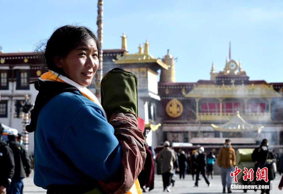 1月12日,西藏拉薩,來自西藏那曲的吉卓瑪歷經(jīng)31天的磕長頭,順利抵達拉薩大昭寺。 李林 攝