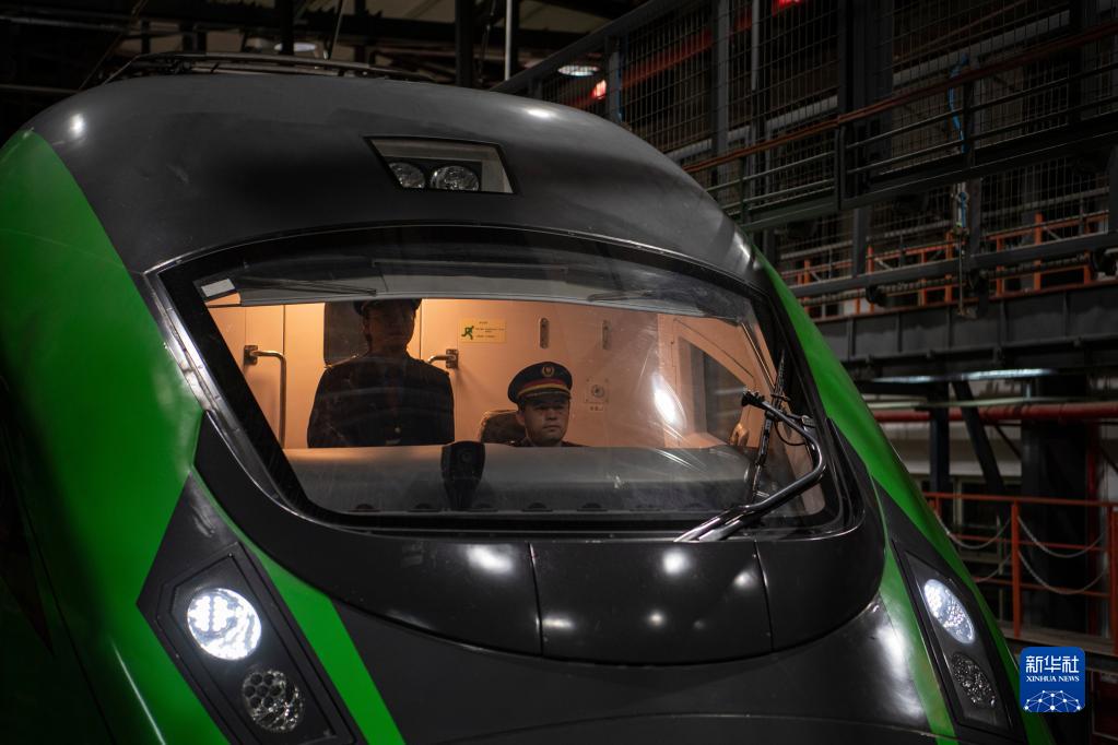 在拉薩機(jī)輛整備中心,黃起崗(右)和同事將動(dòng)車組駛?cè)胪\囄恢茫?月11日攝)。新華社記者 孫非 攝