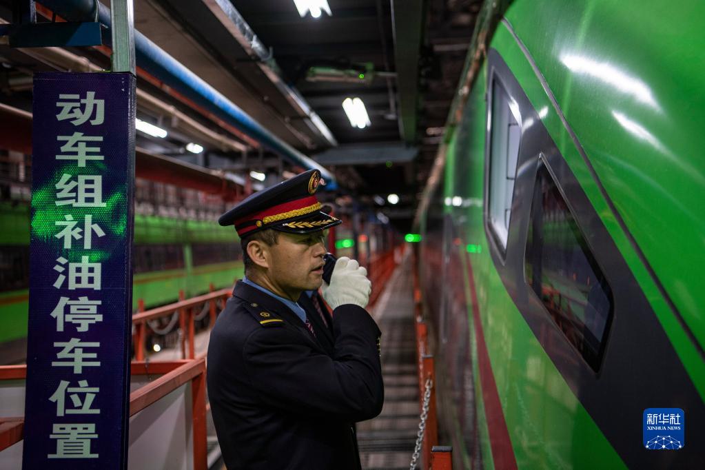 在拉薩機(jī)輛整備中心,黃起崗在和一體化調(diào)度中心確認(rèn)動(dòng)車組補(bǔ)油位置(1月11日攝)。新華社記者 孫非 攝