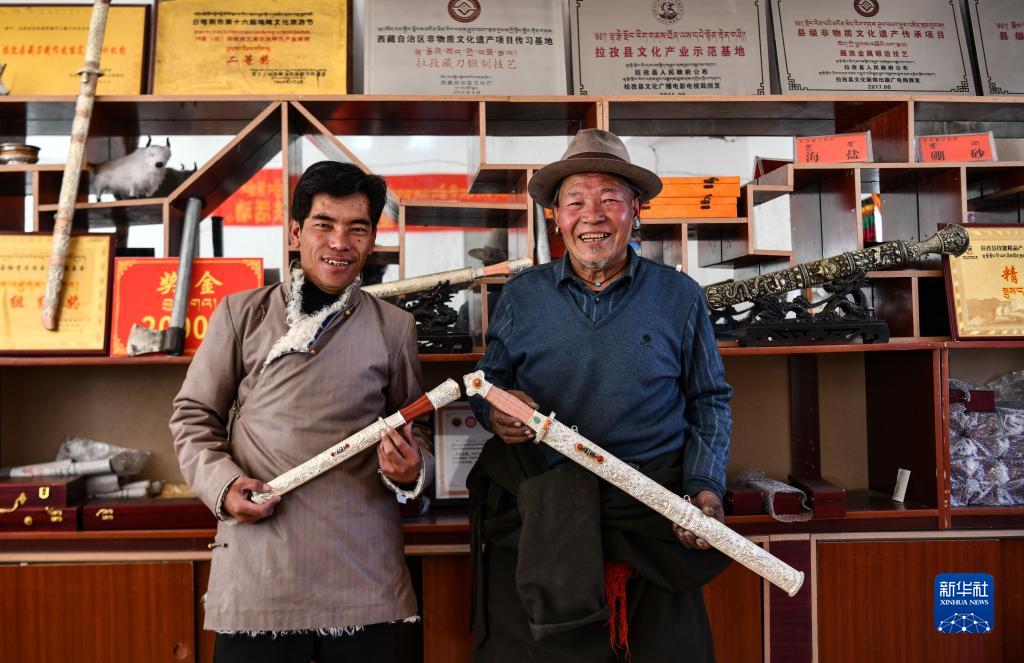 普達瓦(右)和兒子多吉占堆一起展示制作好的拉孜藏刀(1月19日攝)。新華社記者 晉美多吉 攝